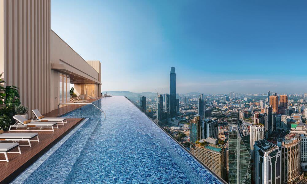 住戸は、ワンルームから家族向けの3ベッドルームまで幅広い間取りが用意されています。共用設備も豪華な仕様となっており、屋上67階のインフィニティプール(市内中心部としては最長の118m)からはクアラルンプールの街を一望できます。63A階には市内最大級のフィットネスジム、12階にはコートヤードガーデン、ラウンジ、プレイグランド、バーベキューデッキなど、都心の中でも憩いの空間が整備されます。